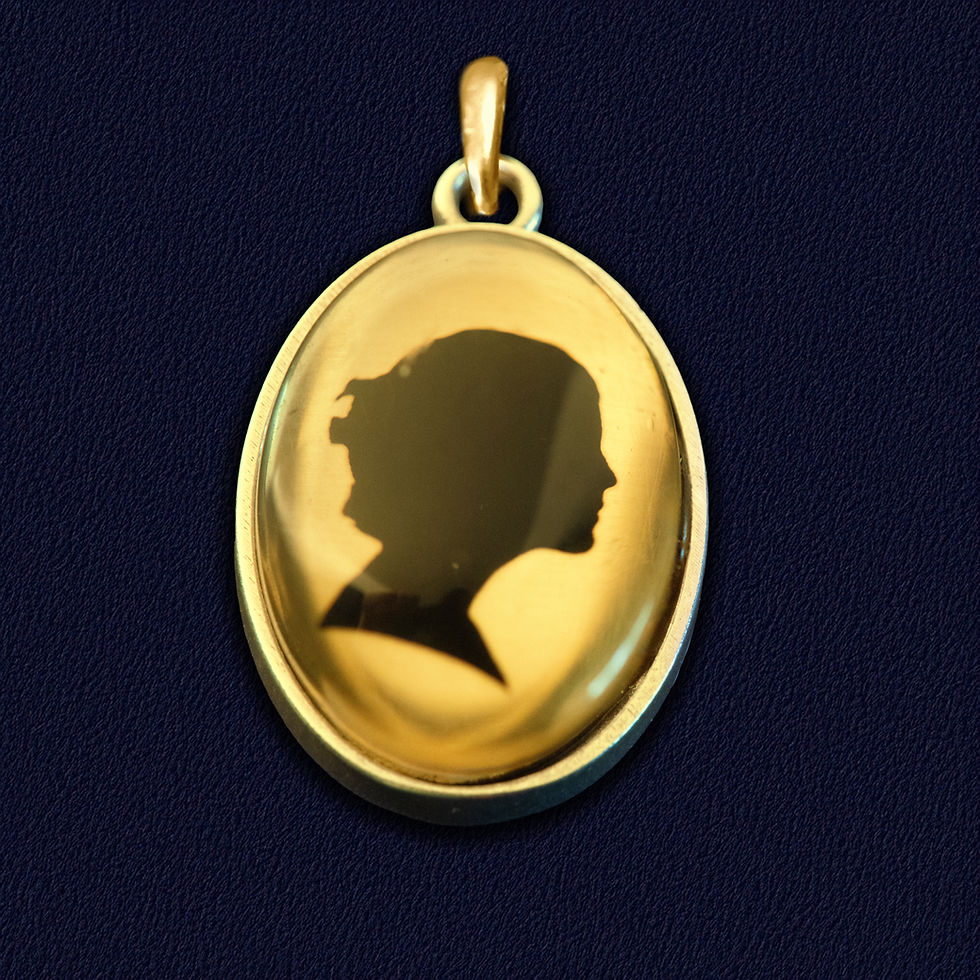 14K Gold incorporating a laser engraved metal insert featuring a submitted portrait silhouette.